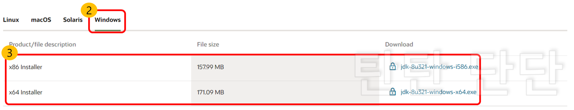 4. 원하는 자바 버전 탭을 클릭한 뒤 'OS 운영체제'에 맞게