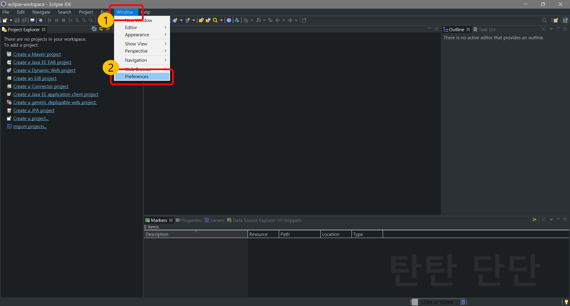8. 이클립스 상단바 'window' > 'Preferences' 를 클릭해주시고,