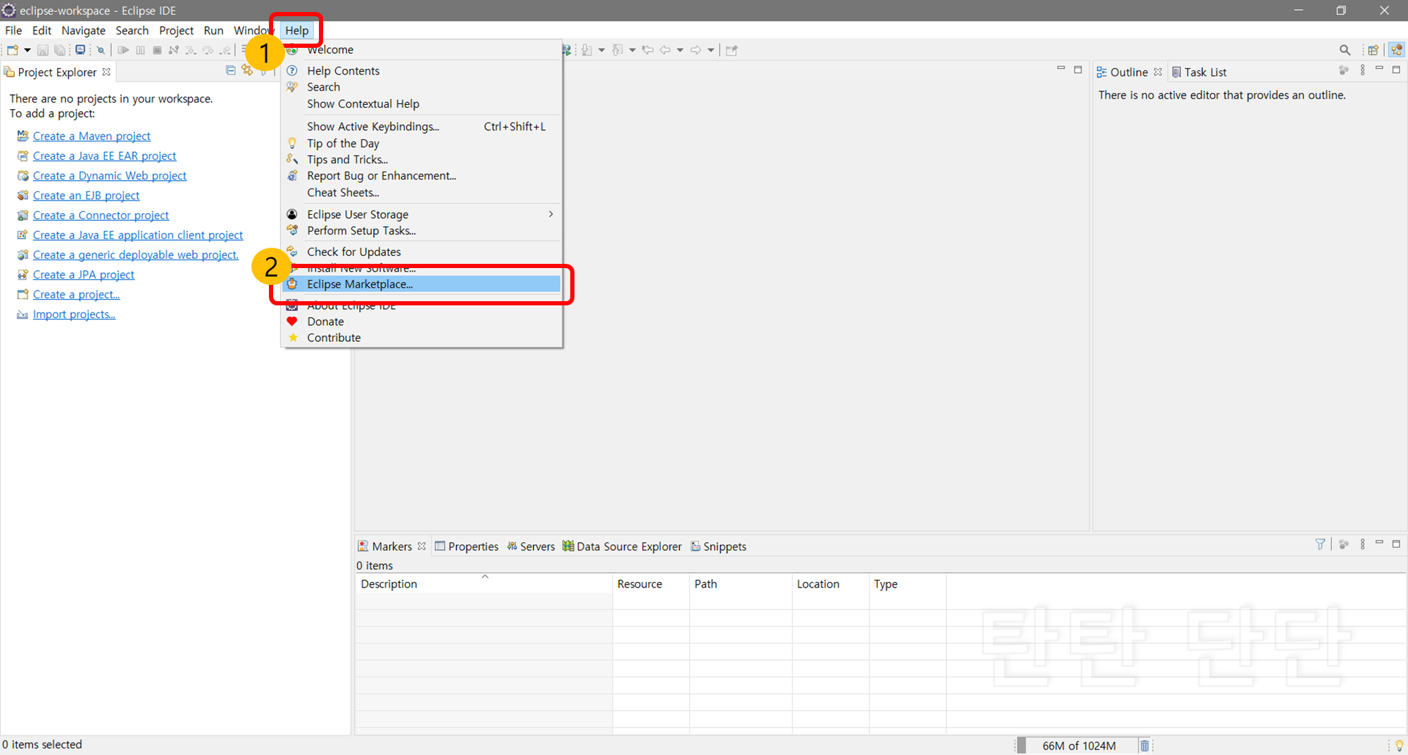 1. 이클립스 실행 후 'Help' 탭에서 'Eclipse Marketplace..' 를 클릭합니다.