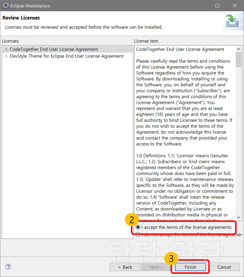 'I accept ~'(동의함) 을 체크하시고 'Finish' 를 하시면 됩니다.