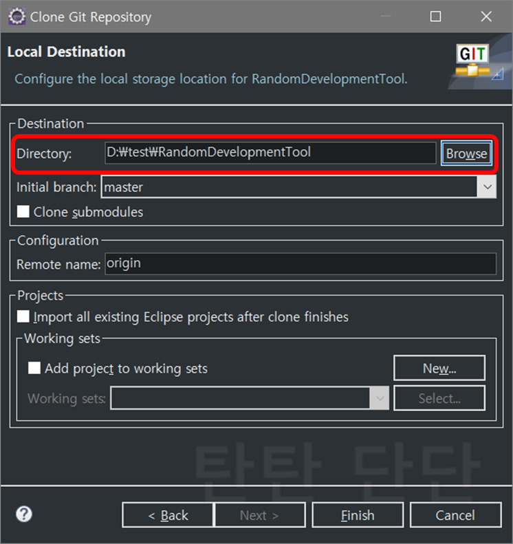 5. github에 있는 프로젝트 repository 를 '로컬에 저장할 위치'를 설정해 주시고