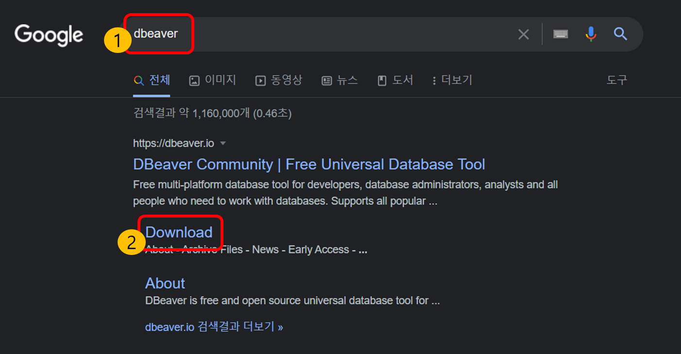 1. 구글에 'dbeaver' 를 입력 후 검색하여 'Download' 클릭