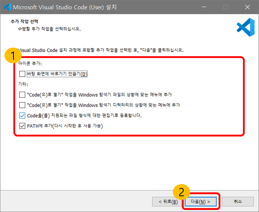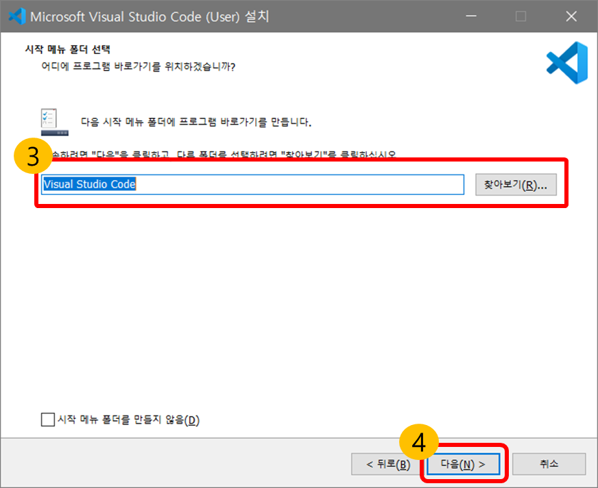 시작 메뉴를 설치할지 선택 후 '다음' 을 클릭합니다.