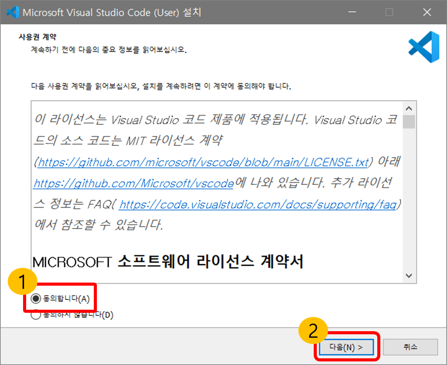 3. 다운 받을 파일을 실행 후 라이선스를 '동의' 를 선택하고,