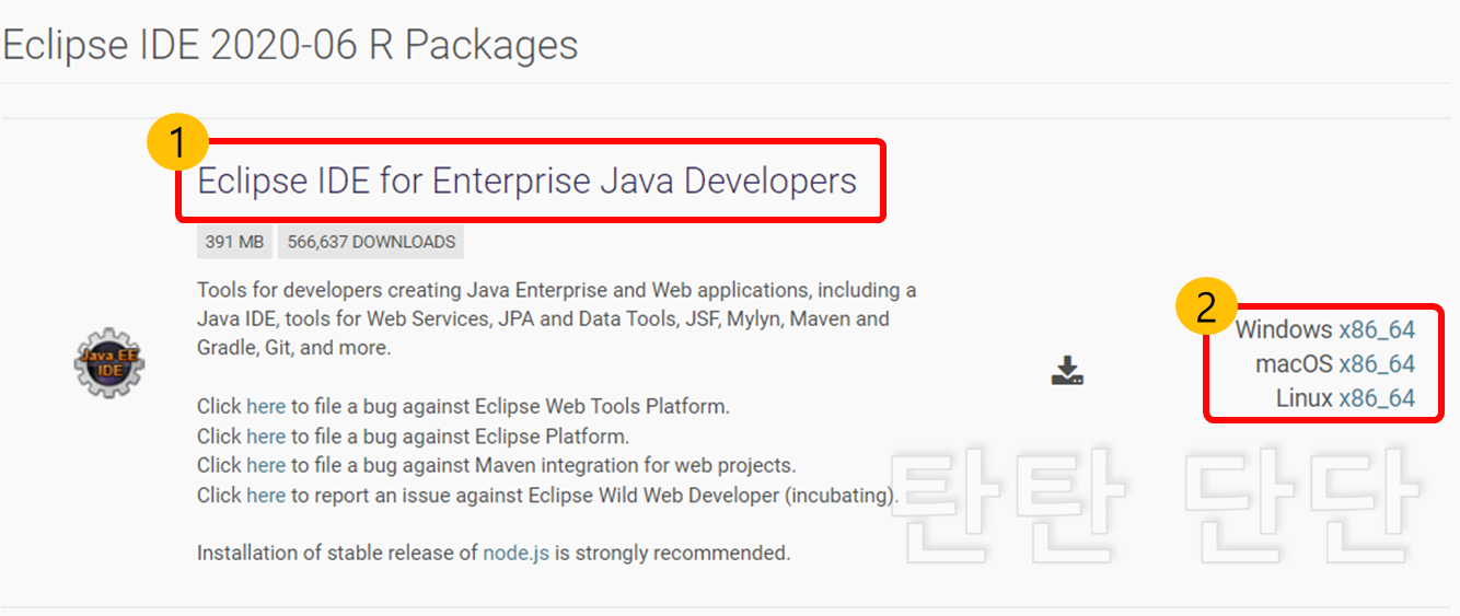 4. 원하는 버전을 고른 뒤 'IDE for Enterprise Java Developers' 에서 'OS 운영체제'에 맞는 것으로 다운