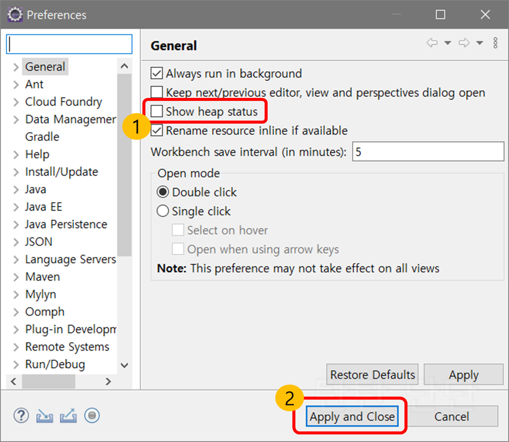 5. 'show heap status' 체크하고 > 'Apply and Close' 클릭
