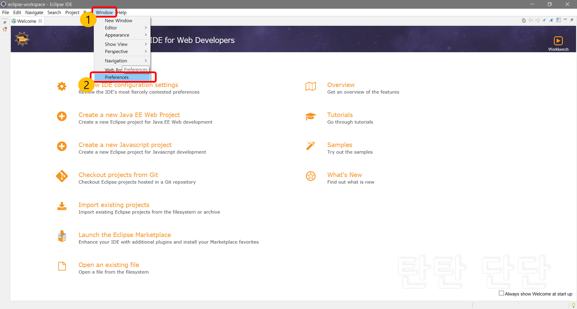 4. 'window' 탭에서 > 'Preferences' 설정 확인