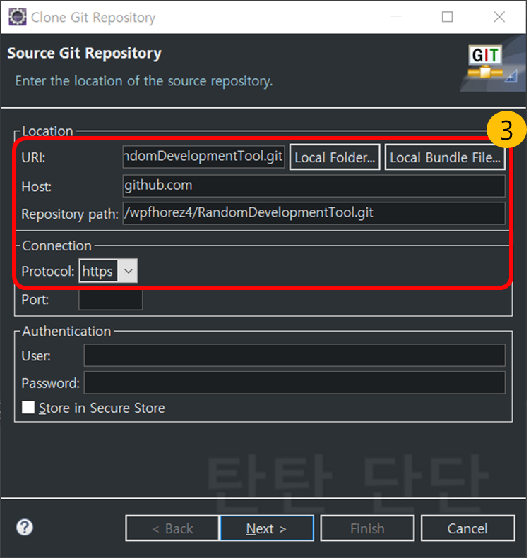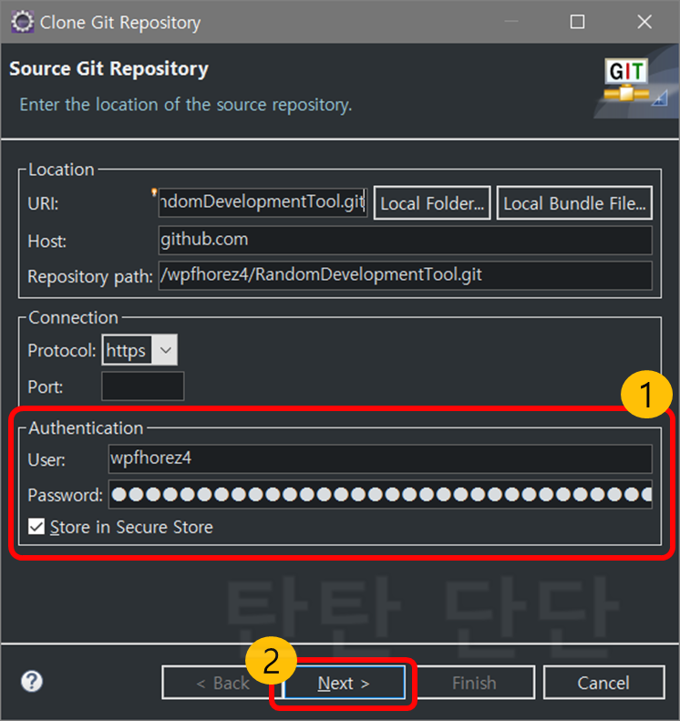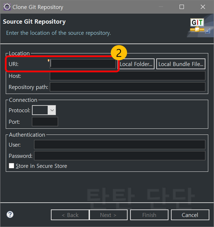 URI 입력란에 'Git 프로젝트 주소' 를 입력하면