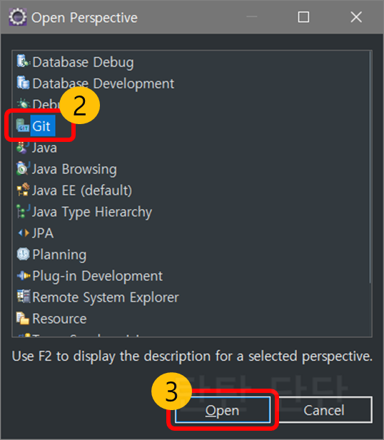 나오는 창에서 'Git' 을 선택하고 'Open' 을 클릭합니다.